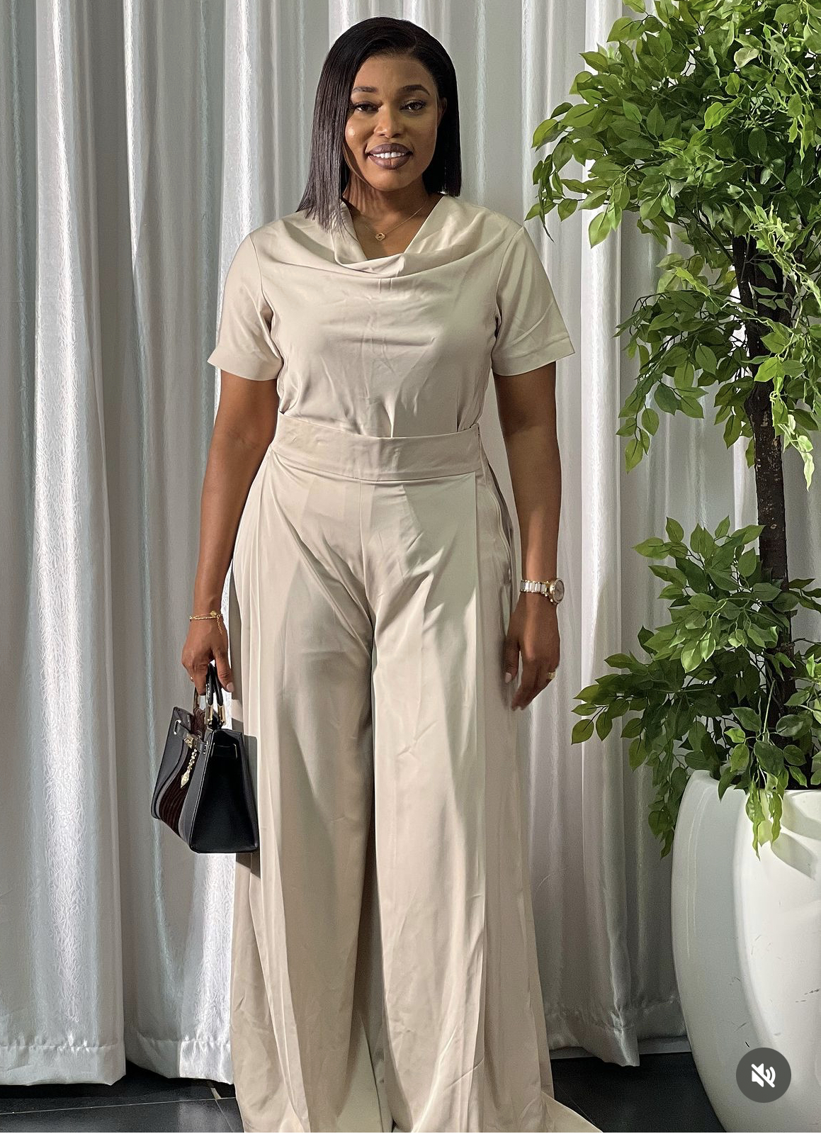 This elegant two-piece features a soft beige cowl neck top with a draped neckline and short sleeves.