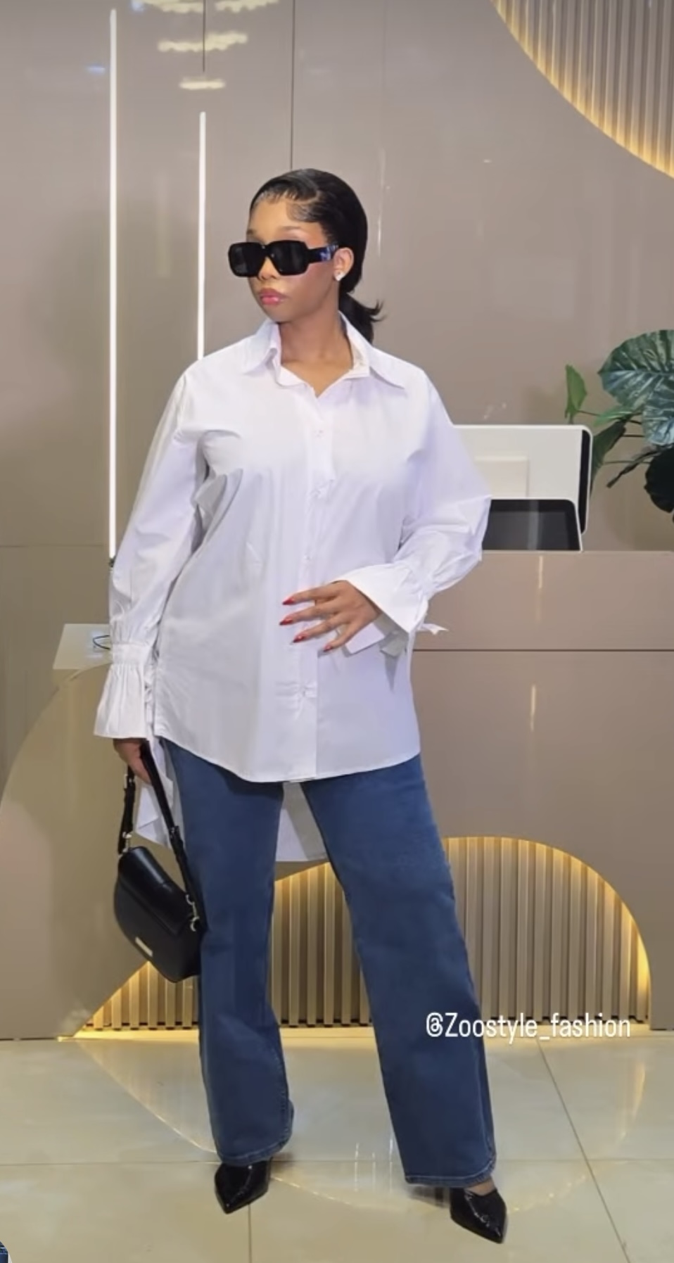 The shirt is an oversized button-down shirt with a relaxed, structured fit. It features a pointed collar, long sleeves and wide cuffs.