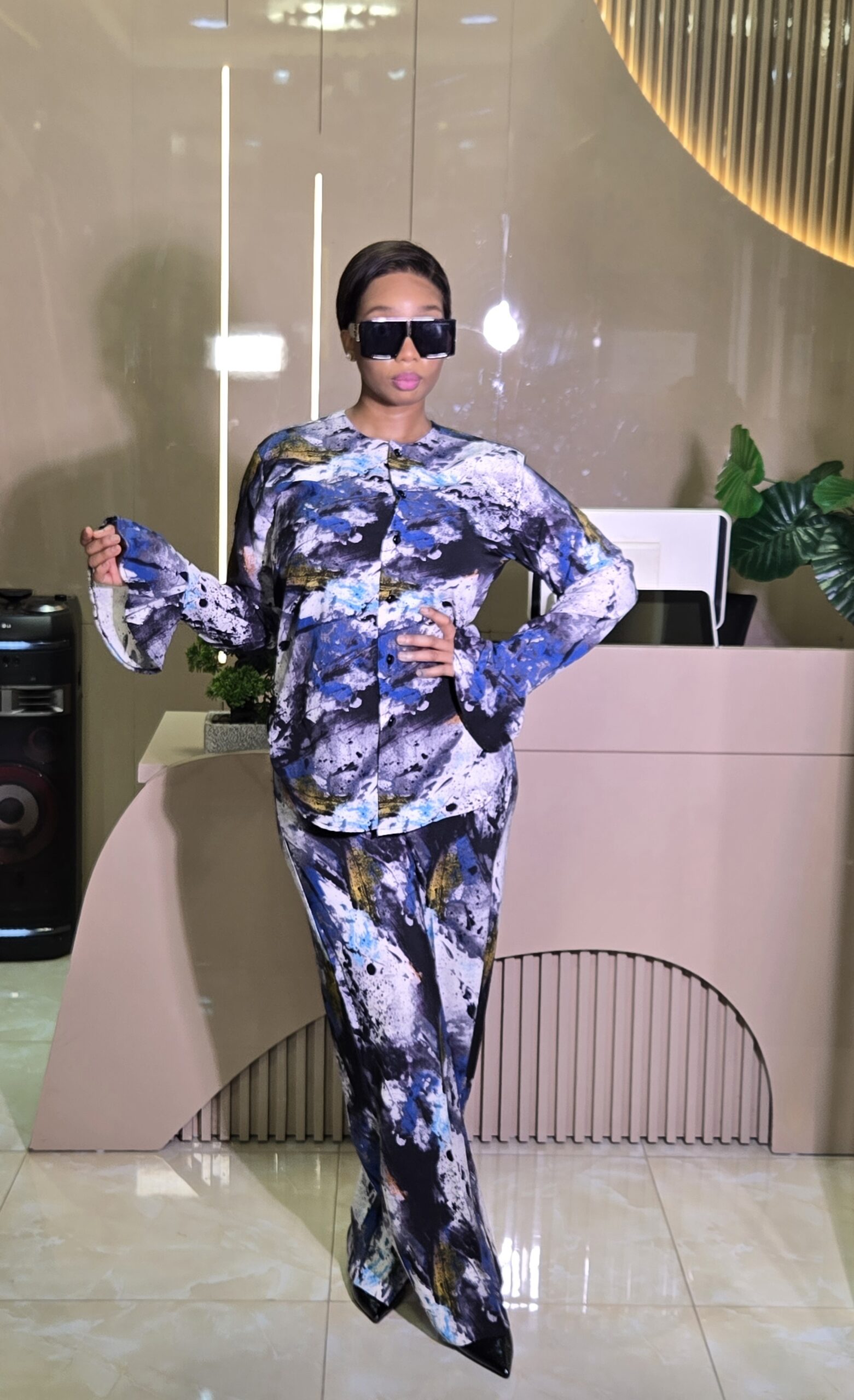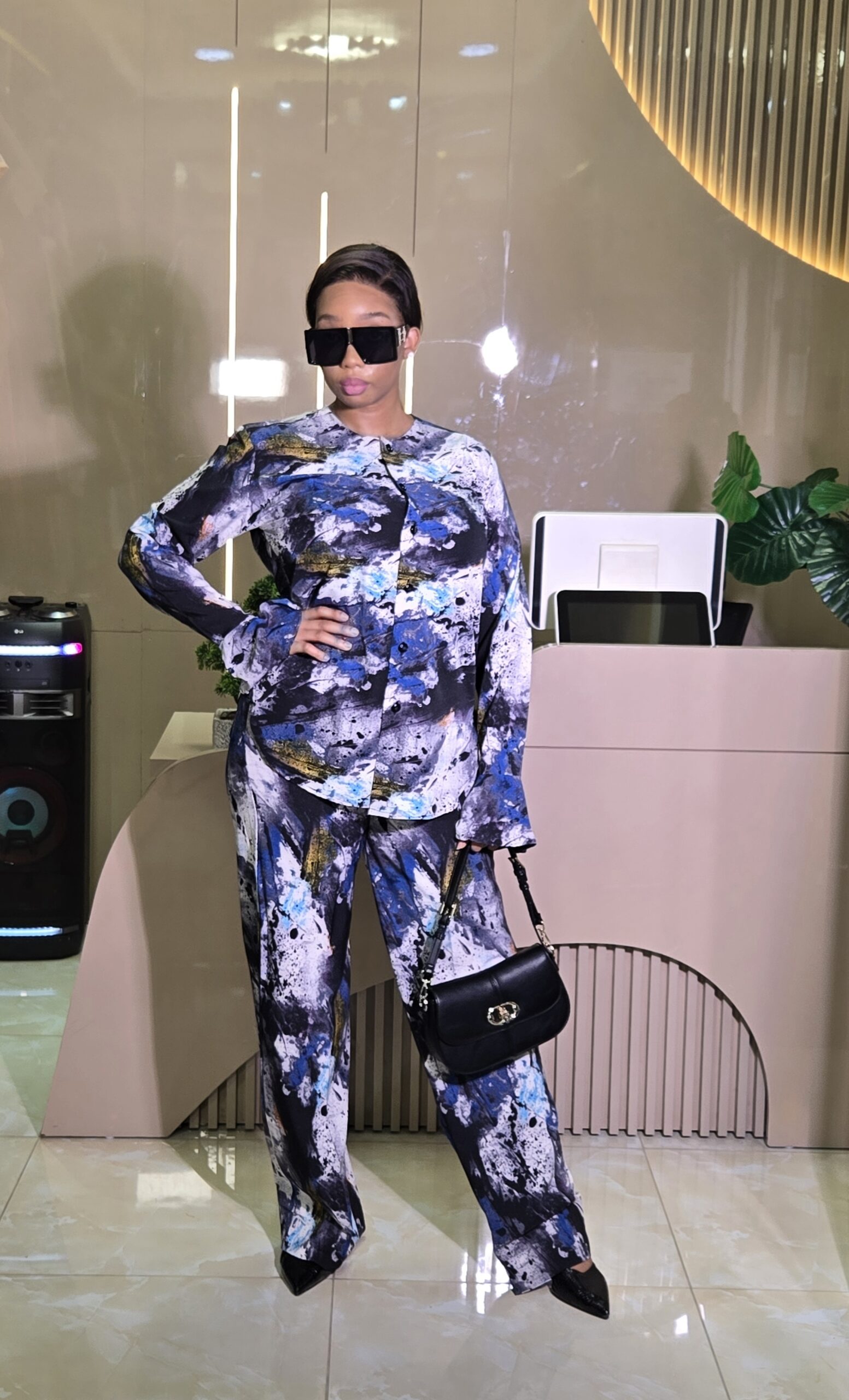 The outfit features a bold two-piece set with an abstract, paint-stroke print in blue, black, white, and hints of gold.