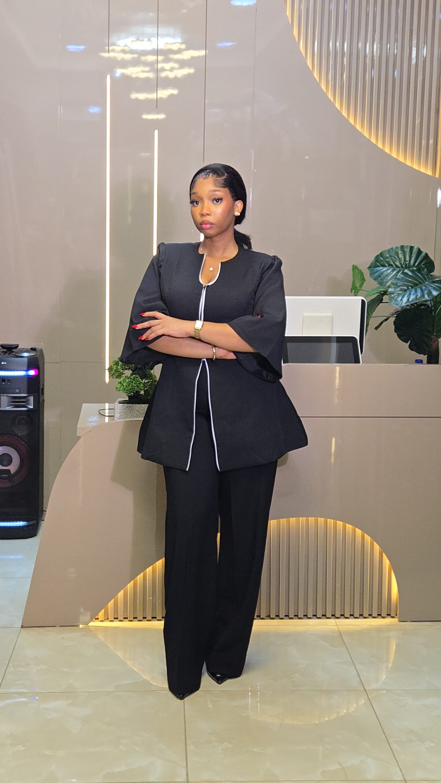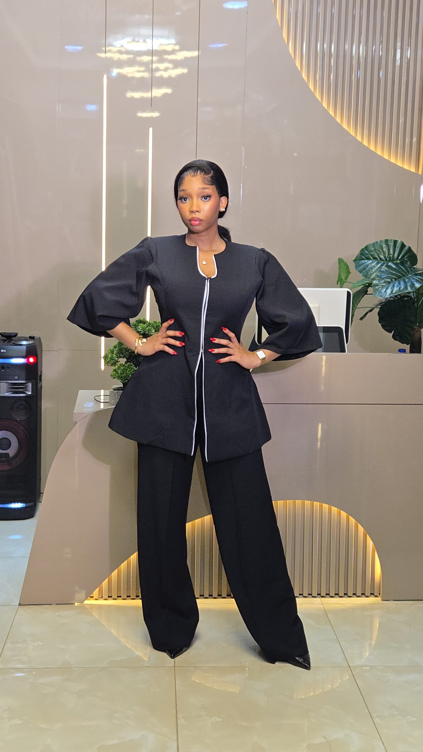 The outfit showcases a chic all-black two-piece ensemble with a structured, modern silhouette. The top features voluminous puff sleeves, a fitted waist, and a front zip detail outlined with white piping for a sleek contrast. Paired with wide-leg trousers, it exudes a blend of power and elegance. The minimalist design and tailored fit make it perfect for a sophisticated, confident look.