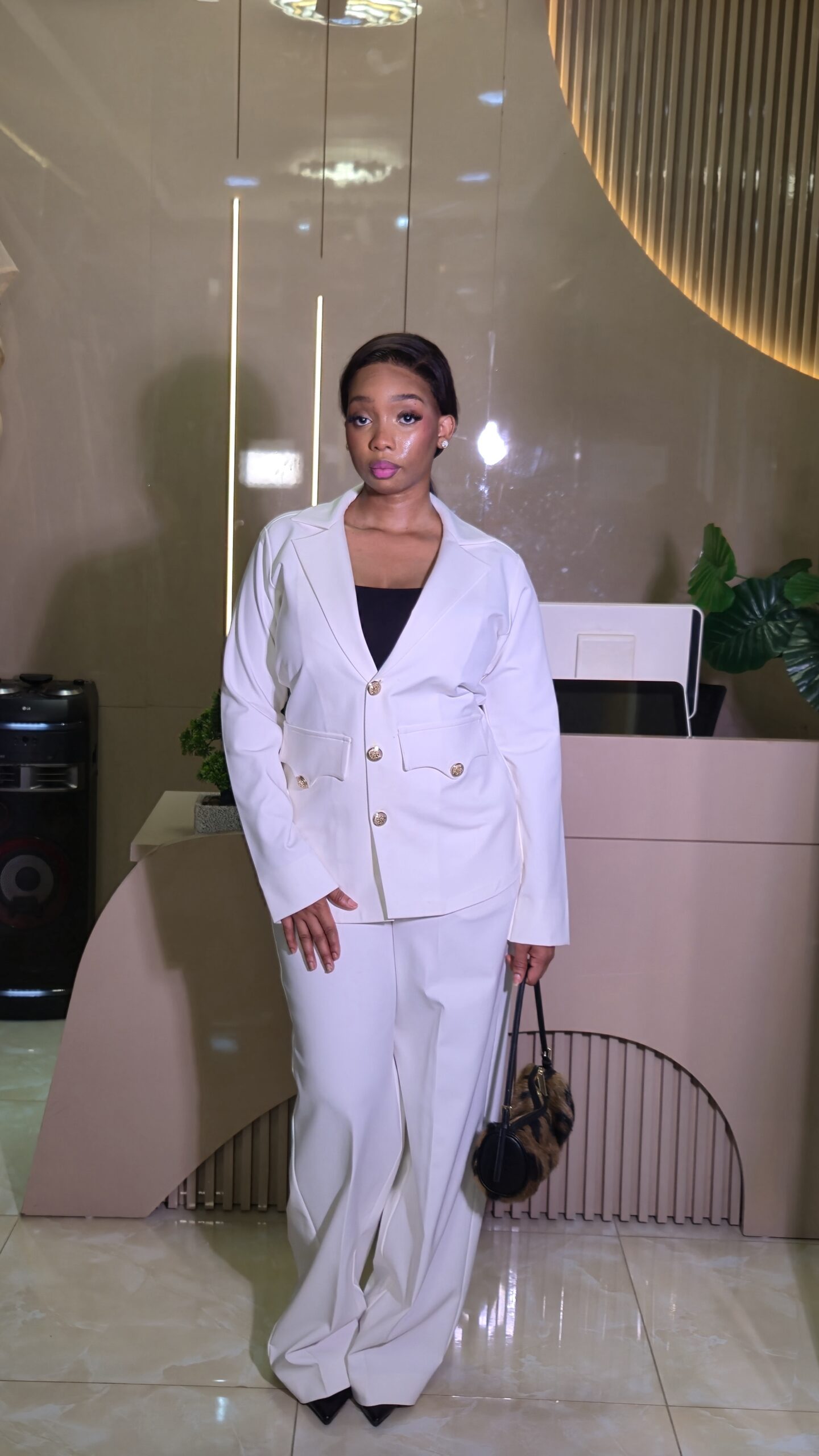 This features a bold two piece set with beautiful details on the body. The golden color buttons are well placed and structured to compliment the jacket.